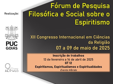 O Fórum de Pesquisas sobre o Espiritismo da Aephus 2025 abriu inscrições para a apresentação de trabalhos científicos e filosóficos que serão compartilhados no XII Congresso Internacional em Ciências da Religião, no Grupo de Trabalho 12 (online). O XII Congresso Internacional em Ciências da Religião da Pontifícia Universidade Católica de Goiás discutirá o tema: “As […]